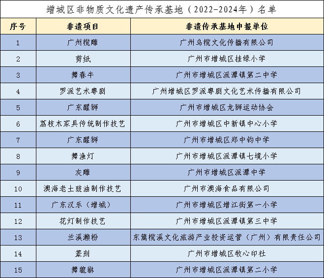 为加强我区非物质文化遗产传承载体建设,拓展社会各界参与非遗保护的渠道,根据《广州市增城区文化广电旅游体育局关于开展增城区非物质文化遗产传承基地(2022-2024年)申报工作的通知》要求,经推荐、专家评审、公示等环节,认定15个单位为增城区非物质文化遗产传承基地(2022-2024年),现予以公布。
